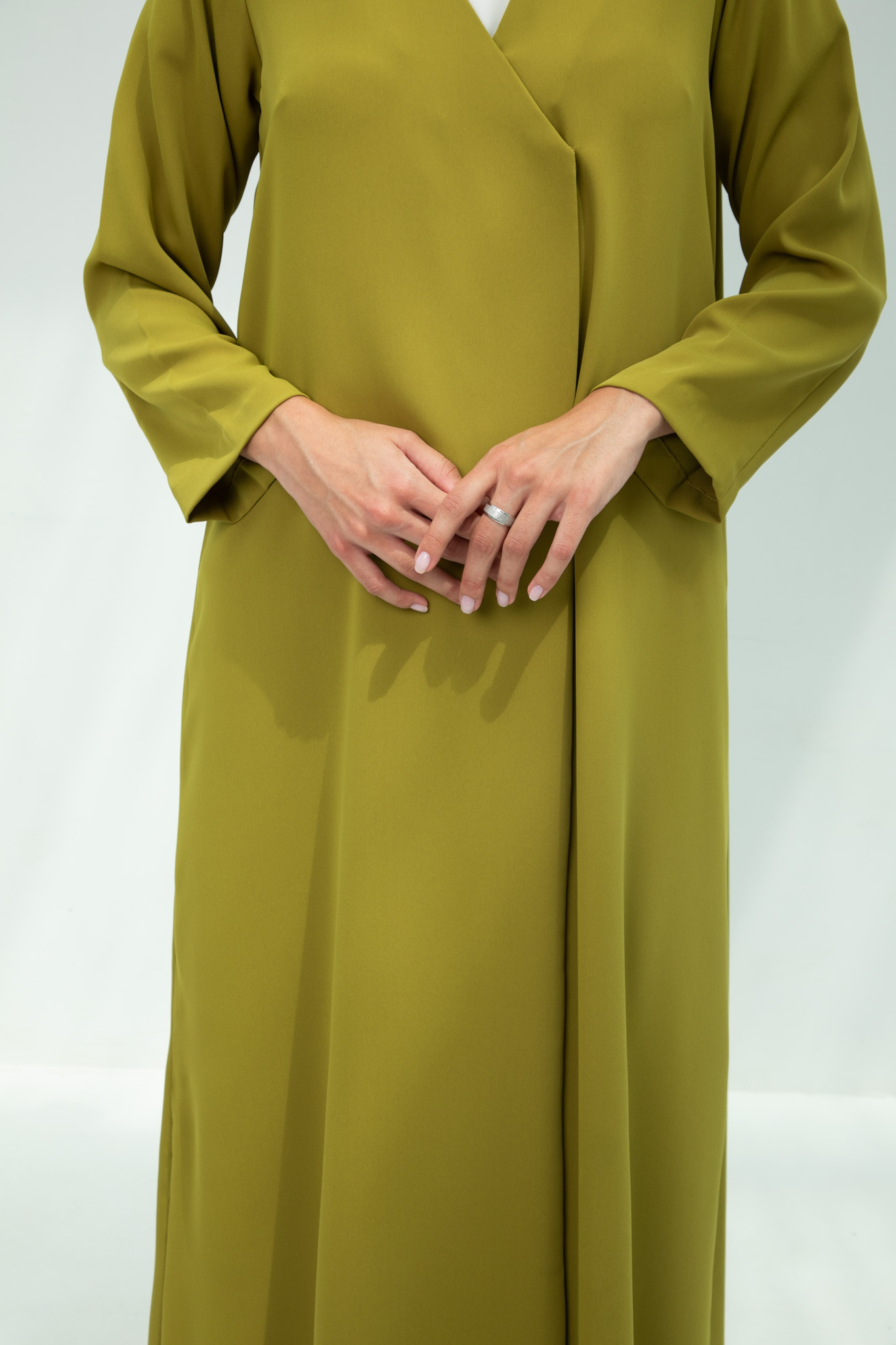 Olive Mustard Draped Abaya Effortlessly elegant, this olive mustard abaya features a sleek overlapping front cut and fluid drape that exudes modern sophistication. Crafted from premium crepe fabric, it offers a refined silhouette with graceful movement. Perfect for both everyday elegance and special occasions.