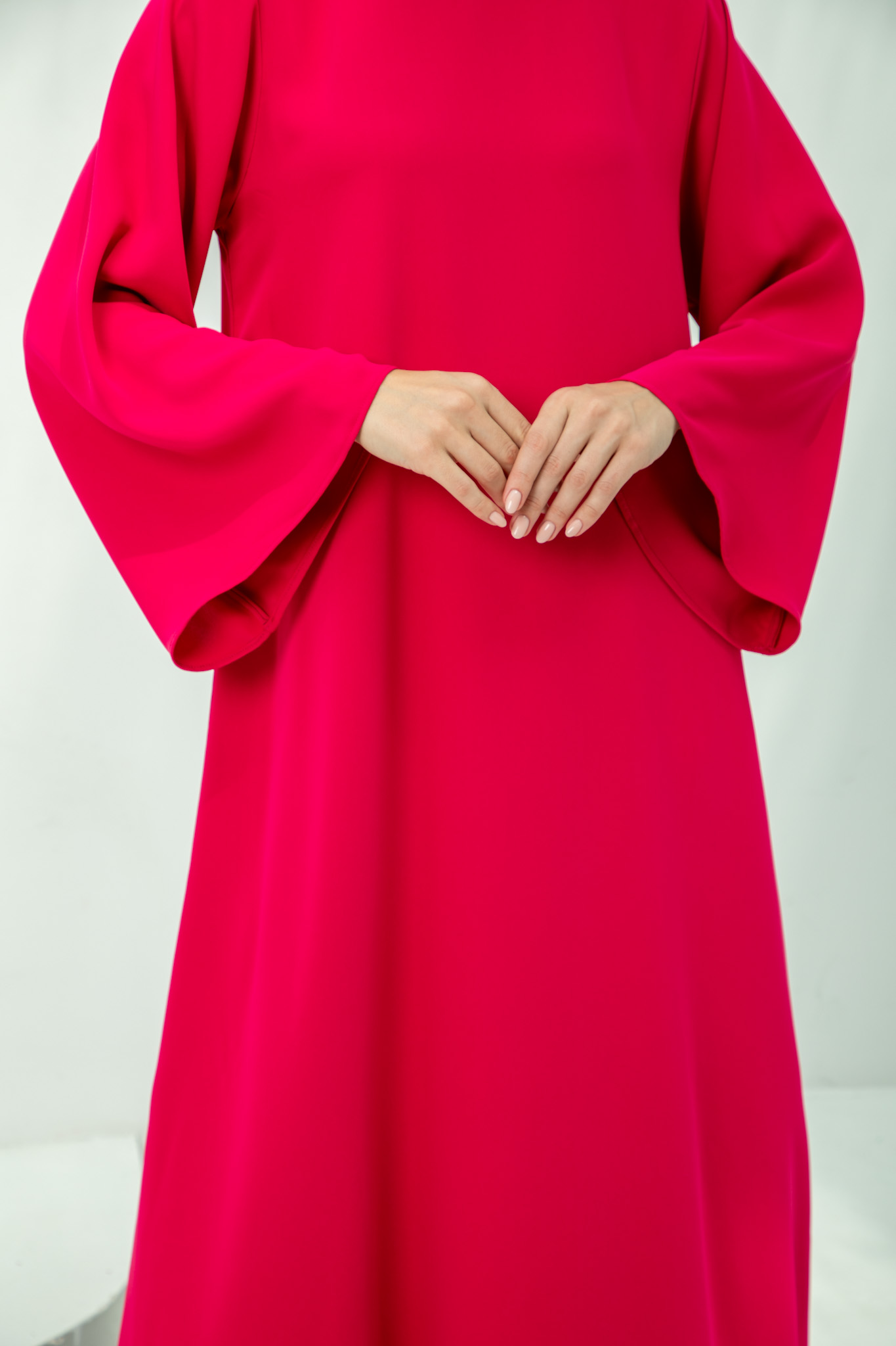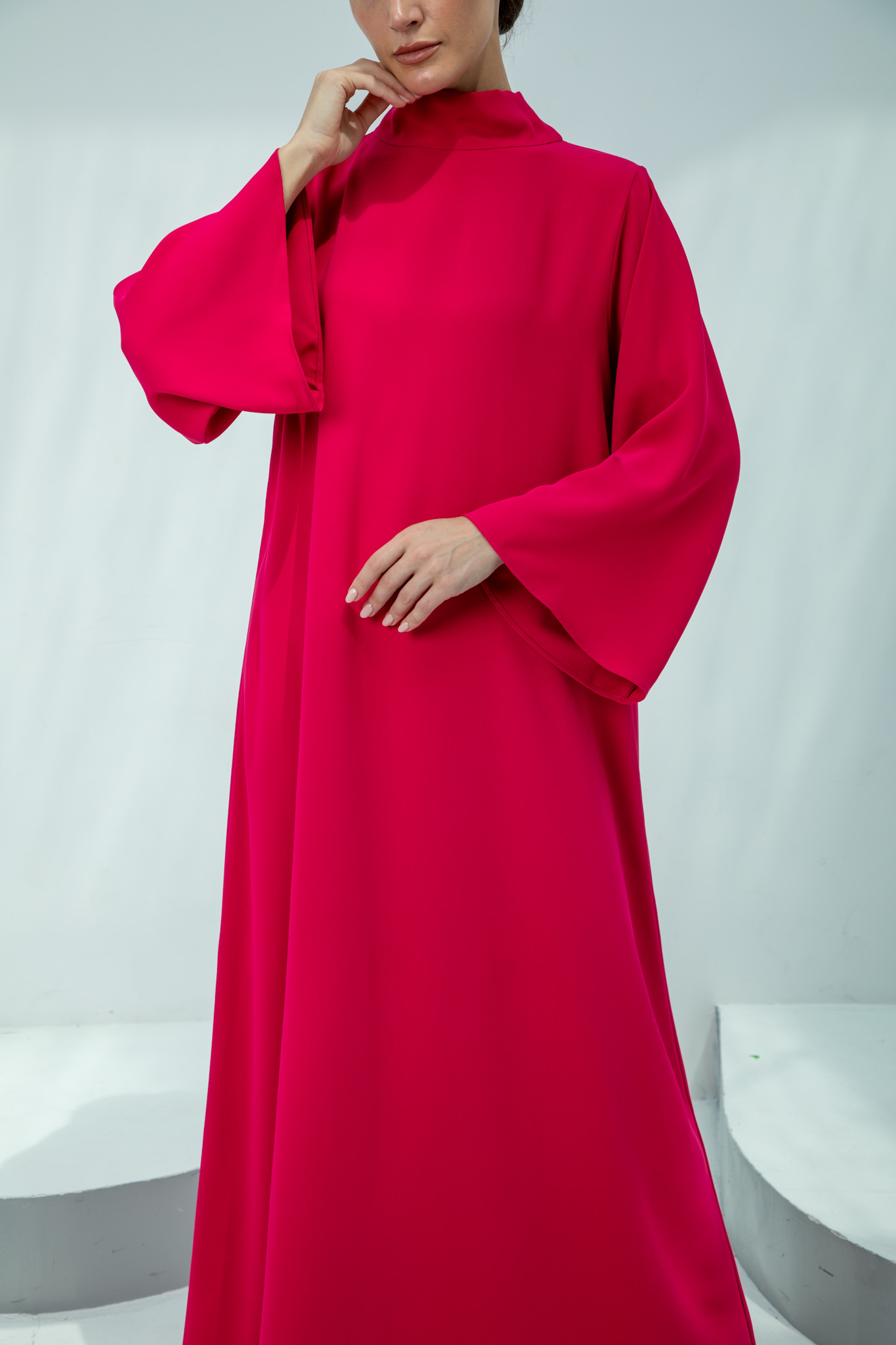 Chic Fuchsia Pink Dress with Bow Tie A bold and sophisticated statement piece. This fuchsia pink dress features a high neck with an elegant back bow tie and comes with a matching headscarf for complete, polished modest style.