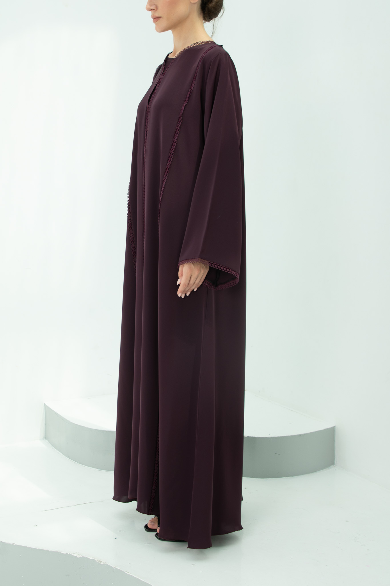 Dark Burgundy Lace Abaya Rich and refined, this dark burgundy abaya features elegant matching lace detailing on the front and sleeves. Complete with a matching headscarf, it embodies timeless modest.